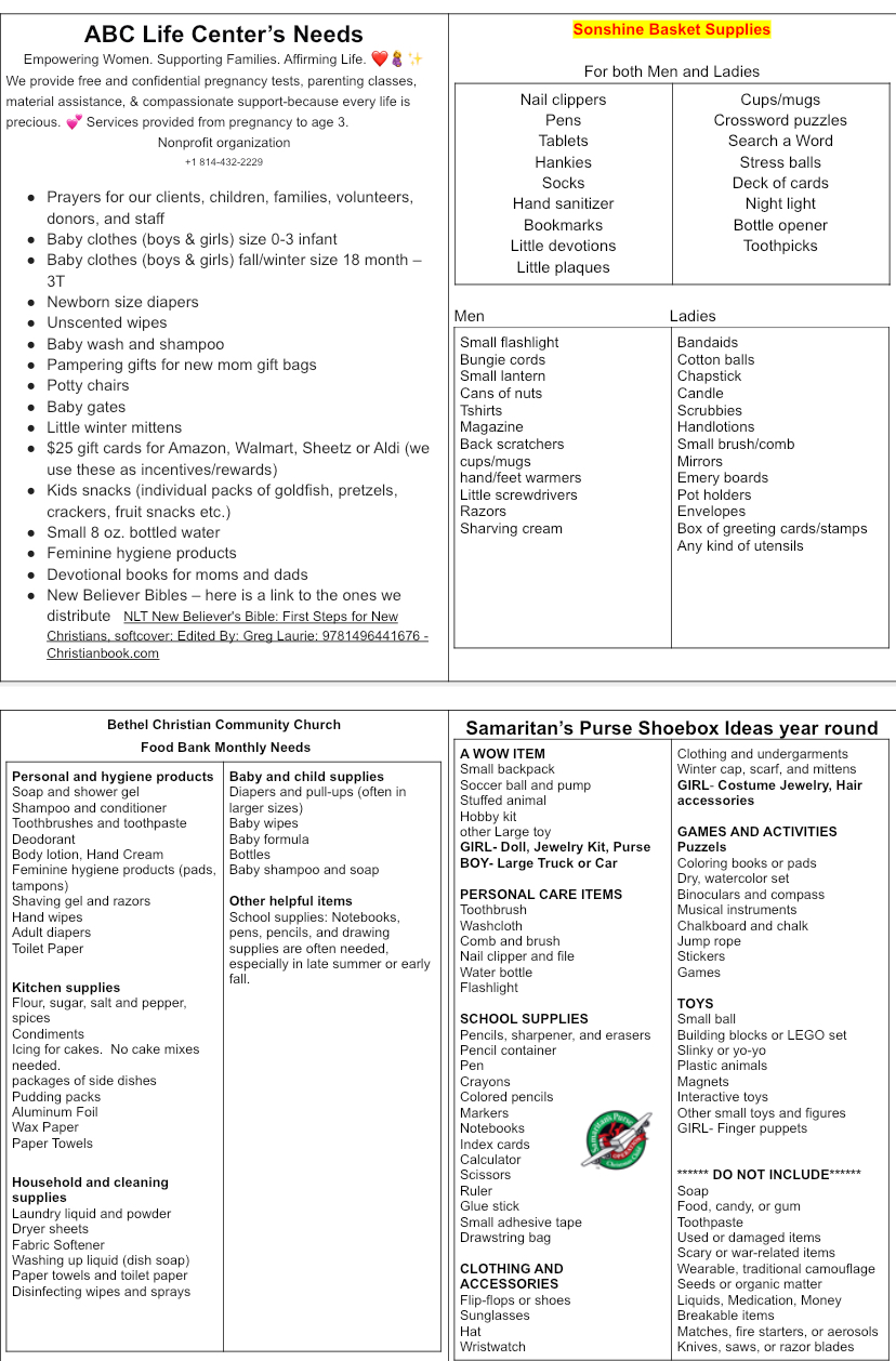 Donation Hill Bible Church supports many missions/ministries. Below is a list of needs requested to support 4 of those missions.